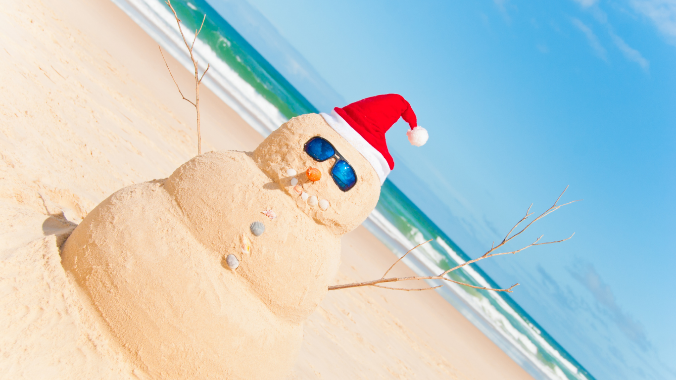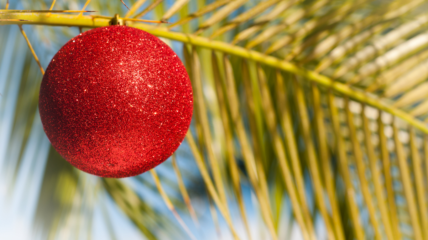 Świąteczne dekoracje tropikalne – choinki z palm kokosowych ozdobione muszelkami i koralikami, girlandy z kwiatów frangipani, a Mikołaj może przybyć na łodzi lub nawet podczas sesji nurkowania.